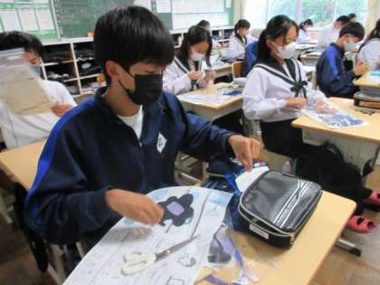 こども園で身に着けるワッペン(名札)を作っています。思い思いのキャラクターを上手に作っていました。