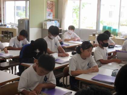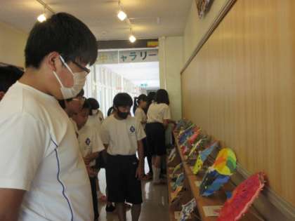 円を2分割して、反対のイメージをもつ抽象的な模様を考えています。「陰と陽」「静と動」などです。先輩の作品を見たり、友達と相談したりしてイメージしていました。