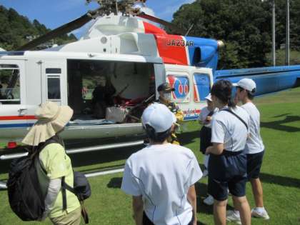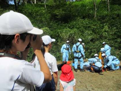 消防ヘリの救助訓練見学会に参加しました。救助の様子やヘリコプターの離着陸などを見学し、消防の方のお話を伺いました。