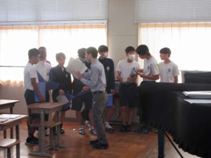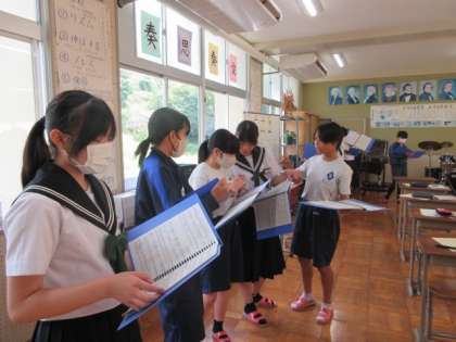 新曲のパート練習をしています。リズムや音程の難しいところを教えあっていました。