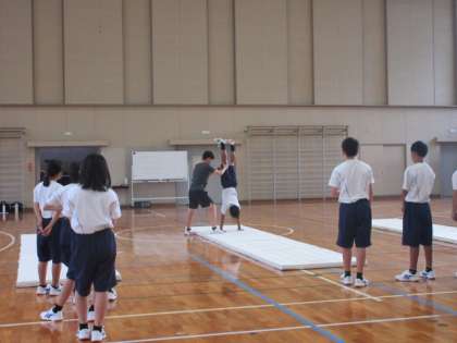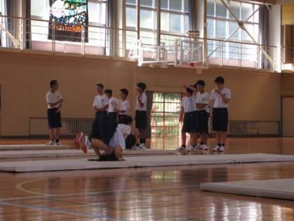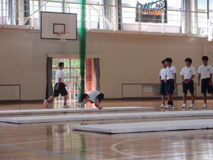 マット運動の学習です。開脚前転や後転、倒立の練習をしていました。