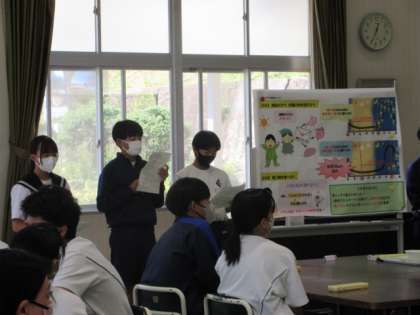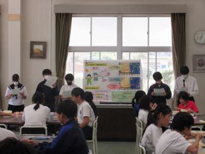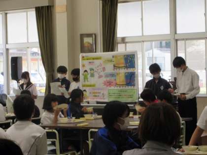 給食の時間を活用して保健委員が活動しています。体調を整えて活動するためには、睡眠や食事をどうすればよいか、わかりやすく説明してくれました。