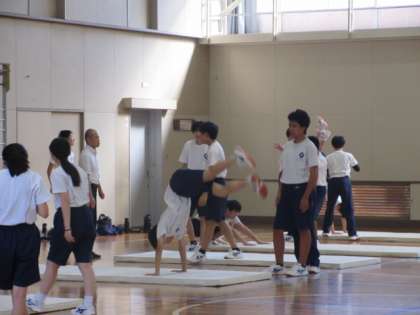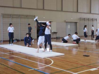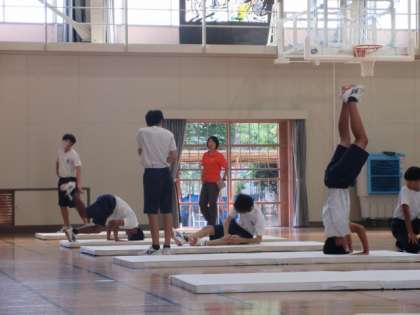 倒立前転の練習です。互いにアドバイスをして、こつをつかんでいるようです。