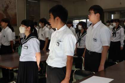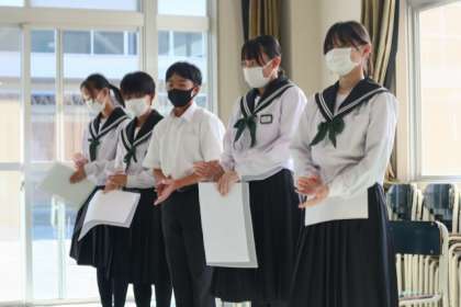 表彰に続き、前期終業式を行いました。職場体験や自然教室の発表、前期の反省と後期の心構えについてのスピーチなど、みんながよく頑張った、成長した前期だったことがよく表れた終業式でした。