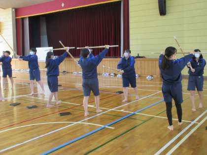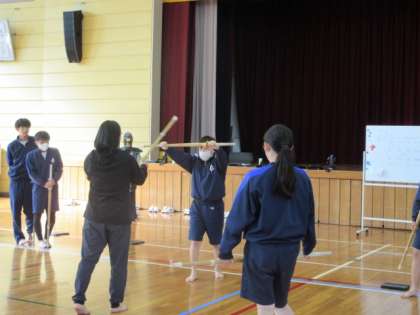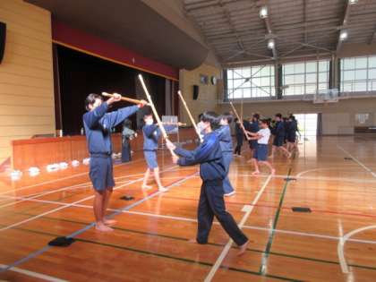 剣道の学習です。ペアで前後に移動しながら打ち込む練習をしていました。