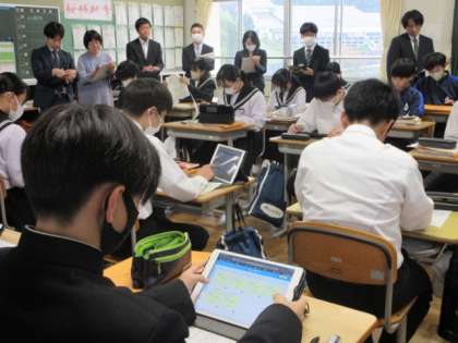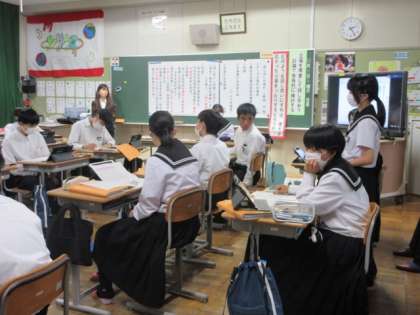 市内の先生方を迎え、討論の授業を行っています。学校の制服の是非について立場を決め、様々な角度から意見を出したり、質問をしたりしていました。