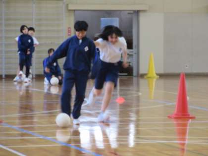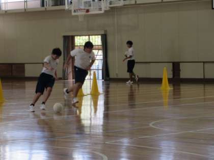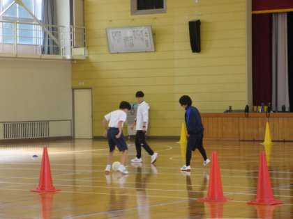 サッカーをペアで練習しています。どう動くとよいかいろいろ試していました。