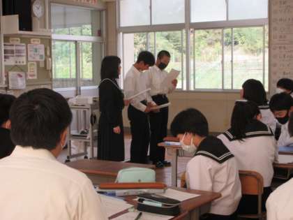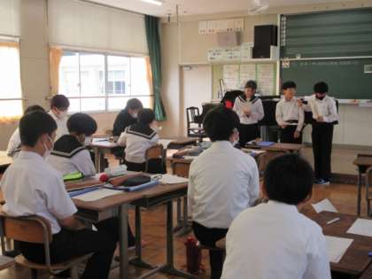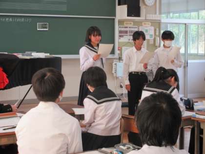 歌曲「魔王」の歌詞を役割を決めて朗読しています。声の出し方や読み方の工夫をして、魔王役、子供役、父親役の朗読をしていました。