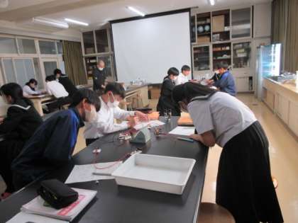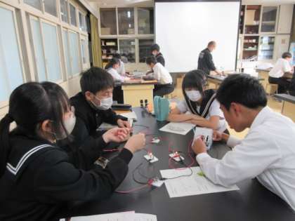 電圧の測定をしています。どう測ったらよいか相談しながら進めていました。