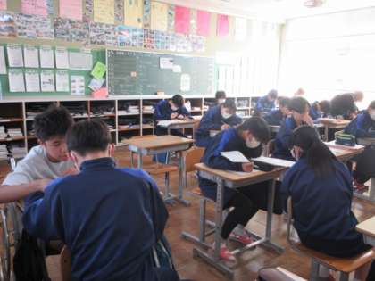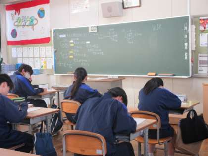 定期テストに備えて、学習のまとめをし、問題を解いています。わからないところを質問して教えあっていました。
