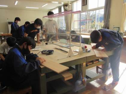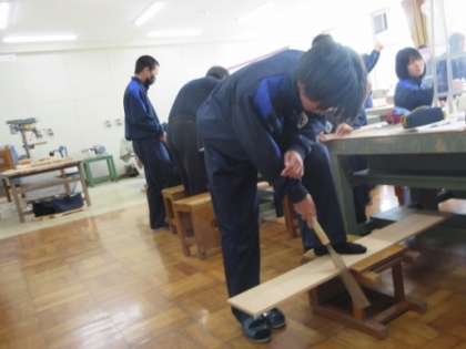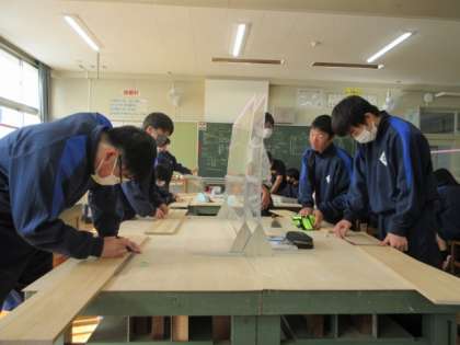 いよいよ木材からパーツを作ります。木材に印をつけ、のこぎりで切っていました。