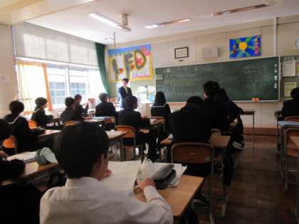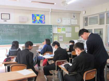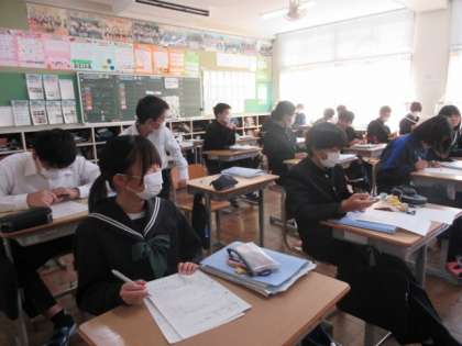 反比例の学習です。比例の場合との違いを考え、xとyの値の変化を調べていました。隣の席の人と助け合っていました。