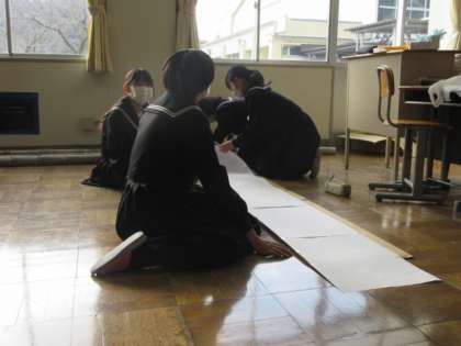 明日の小原四季桜まつりの活動に備えて、看板づくり、自分たちで作った「小原の紹介」の二次元コードの表示づくり、グッズの仕上げに取り組んでいました。3年生が作った「小原の紹介」は、このホームページの「配布文書」からご覧になることができます。5か国語の力作です。どうぞご覧ください。
