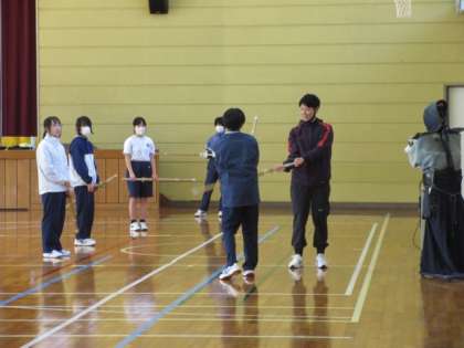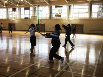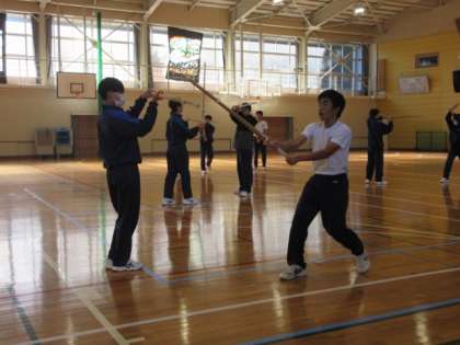 剣道の学習です。「めん」「こて」「どう」と声を出しながら、ペアで練習していました。