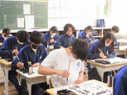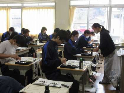 書き初め「不屈の精神」の練習をしています。「屈」がなかなか難しいのか、手本をよく見てゆっくりと書いていました。