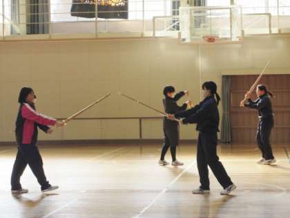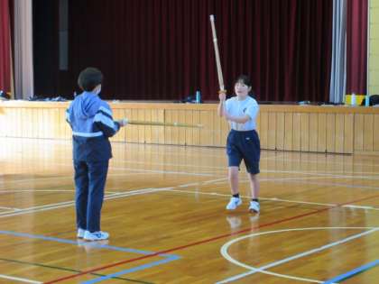 剣道の学習です。試合形式で攻守を決めて練習していました。動きや声がだんだん様になってきました。