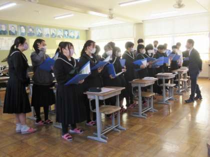 「旅立ちの日に」のパート練習後、合唱しています。クレシェンドに気を付けて歌っていました。3年生が歌うと胸に迫るものがあります。