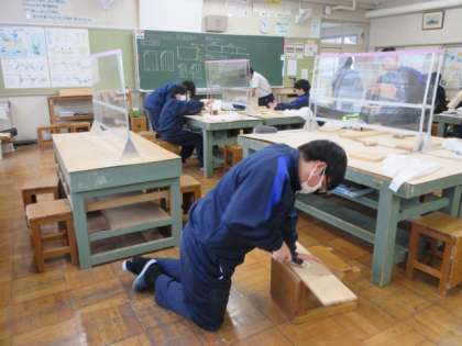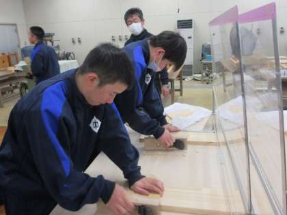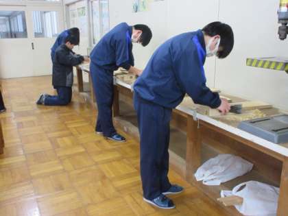 本立ての部品を切り出し、かんなをかけています。作品の形が見えてきました。