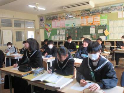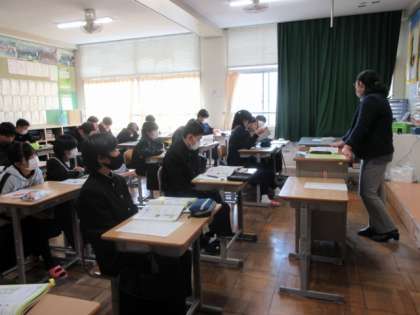 既製服に付いているタグについての学習です。どんなことが表示されているのか、教科書を見ながら、ワークシートに書き込んでいました。