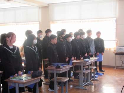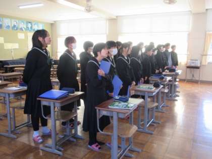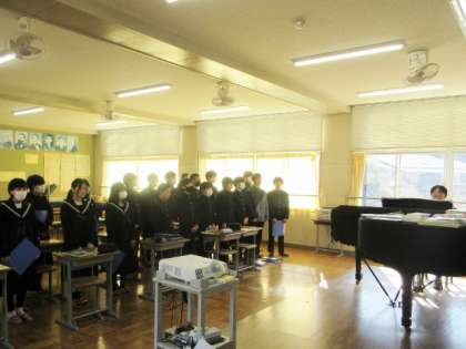 卒業式で歌う合唱曲を歌っています。パート練習の後、合唱してみて歌いにくいところの練習をしていました。