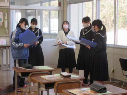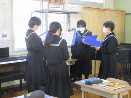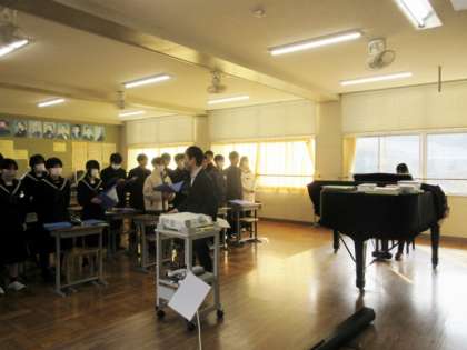 卒業式で歌う歌のパート練習をし、合唱しています。難しい伴奏を弾いているクラスメートに声を合わせていました。