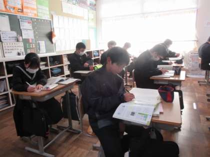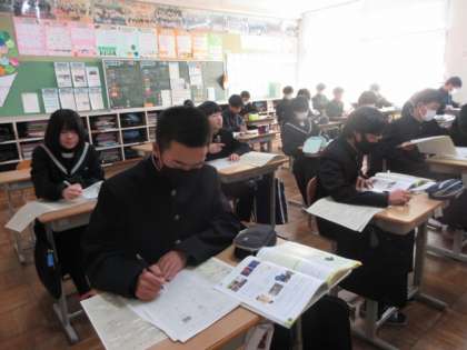 衣料の素材についてまとめをしています。ポリエステルが多く含まれると生地が伸びるなど、既製服を選ぶときに役立つ学習内容の復習をしていました。