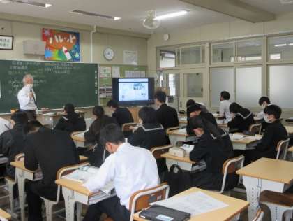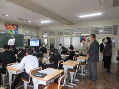 今日は学校運営協議会の委員の皆さんに授業での生徒たちの様子を見ていただきました。3年生は社会の時間です。