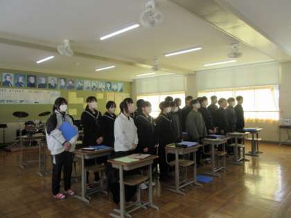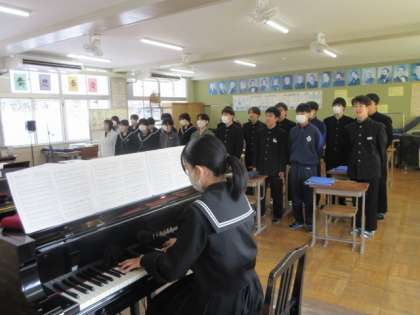 合唱の練習をしています。出だしのそろえ方、音符が細かい部分の歌い方など、先生のアドバイスを聞きながら調整していました。