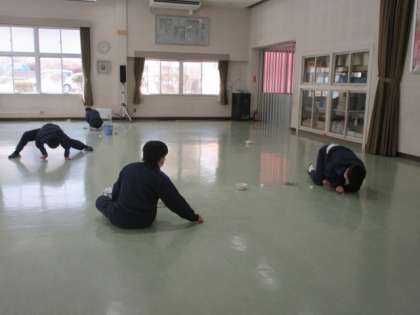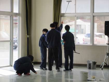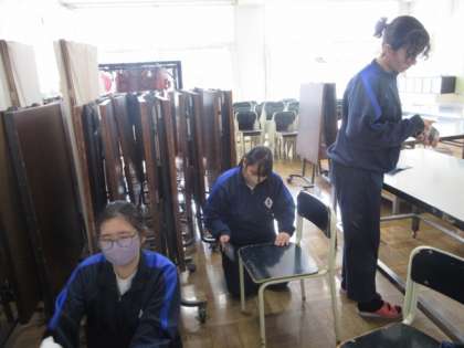 3年間過ごした学校をきれいにしようと、3年生が顕彰館をきれいにしています。椅子のささくれを削ったり、配膳台の錆を落としたり、床の汚れを落としたり、ていねいに取り組んでくれました。
