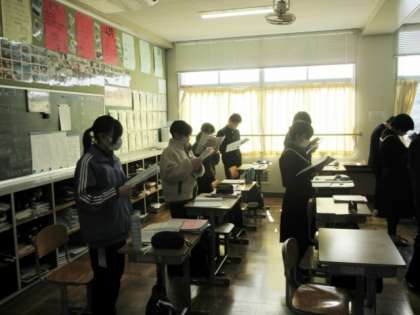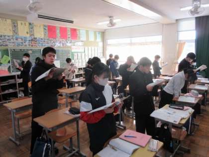 教科書の会話文をみんなで練習してから、一人ずつの練習をしています。