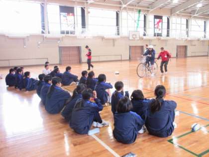 豊田市交通安全学習センターのスタッフの方を講師に迎え、交通安全講習会を行いました。自転車を運転するときに気を付けたいことについてお話を伺った後、実際に自転車を使って危ない運転をしたり見たりしました。車の運転者からの死角を知る活動は、一人ずつ運転席に座って確認していました。