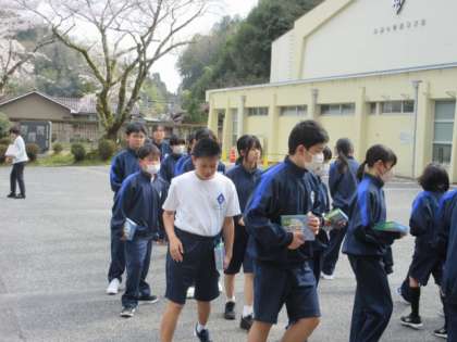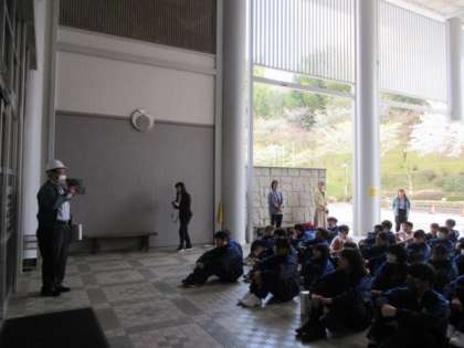 地震からの火災を想定した避難訓練と、土砂災害から避難するための交流館への移動訓練を行いました。非常食を持ち、交流館に移動し、館長様より避難場所についてのお話を伺いました。
