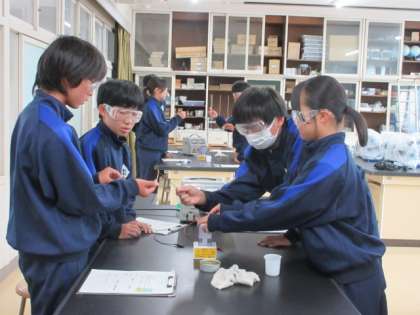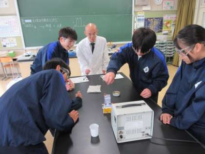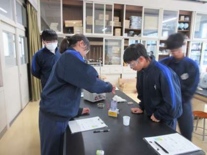 水を電気分解したらどうなるか、実験をしています。操作する人の手元をじっと見て、変化を観察していました。