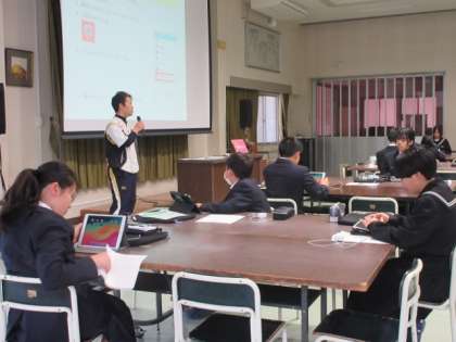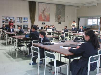 全校で集まり、情報主任の先生からタブレットの扱いについての話を聞いています。その後、1年生は中学校入学で端末が変わったため、パスコードを変えるなどの作業をしていました。