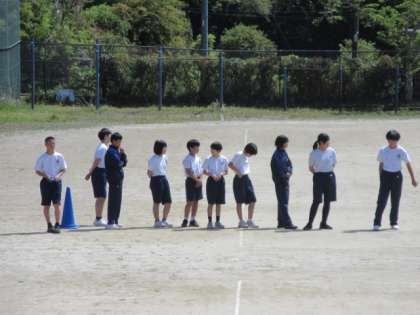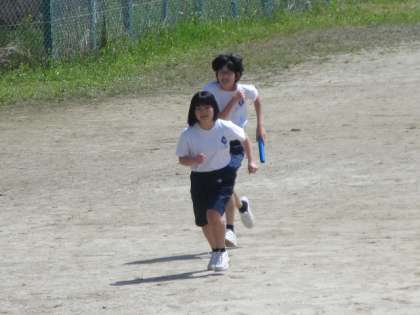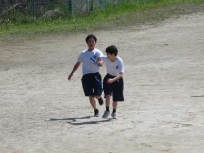 体育祭の種目の一つ、全員で走るリレーの練習をしています。声を掛け合って、うまくバトンパスできるよう練習していました。