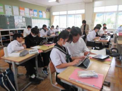 「保護者が絶対に行きたくなる旅行プランを提案しよう」を目標に、英語で提案を考えています。タブレットで調べたり、友達の話を聞いたりしていました。