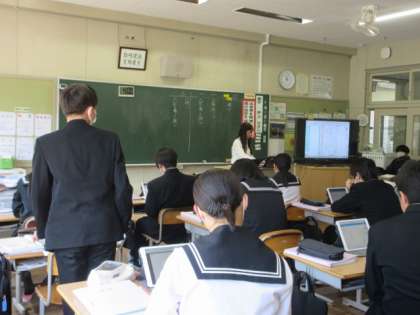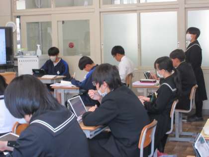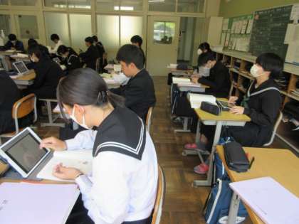 教材の場面の読み取りをしています。教科書のどの部分でそのことがわかるかをタブレットで確認しながら進めていました。