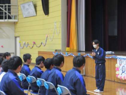 1年生の入学を歓迎して、2、3年生が祝う会を開催しました。生徒会長歓迎の言葉、各部活動の紹介、グループに分かれてのクイズ、借り人競争と続き、最後に1年生からお礼の言葉がありました。温かく楽しい会になりました。