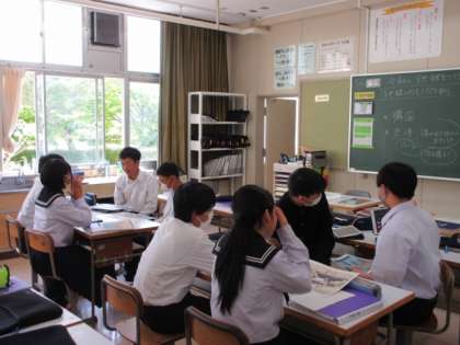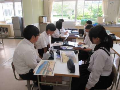 浮世絵の鑑賞です。「東海道五十三次」の中の一枚をそれぞれ鑑賞し、グループで話し合っていました。