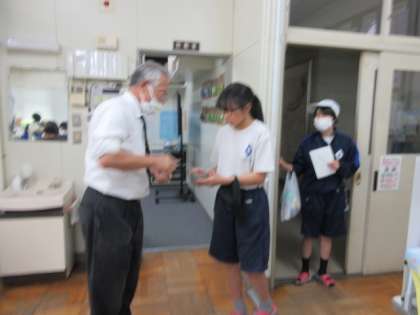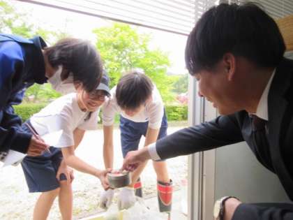 SUで育てたオクラの苗を先生に販売しています。お金の計算をしたり、渡すときに「これはいい苗ですよ」と言い添えたり、上手に販売をしていました。