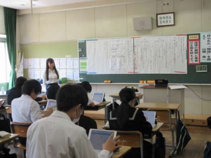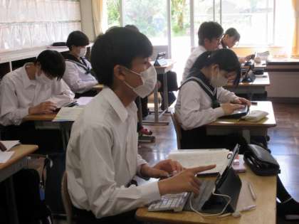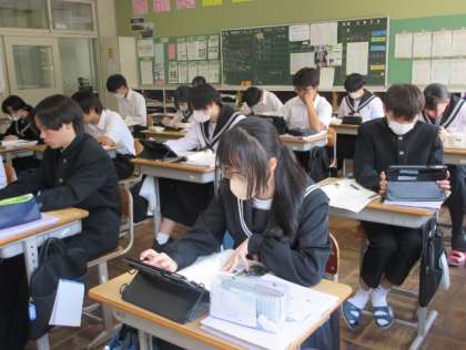 タブレットの中のワークシートに読み取ったことを書き込んでいます。教材を何度も読んで考えていました。