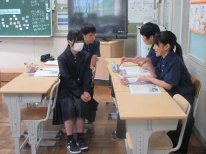 「公平」について話し合っています。実際の場面を思い浮かべながら、考えを出し合っていました。