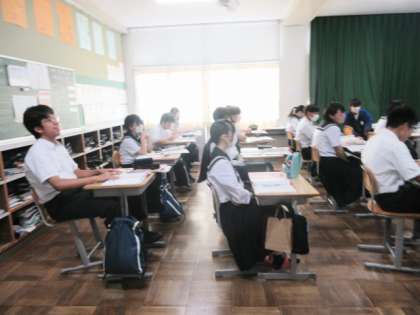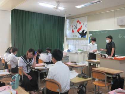 日本語で示された単語を英語で答えたり、リスニングをして問題を解いたり、ペアで会話練習をしたり、楽しい雰囲気で授業に参加しています。