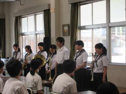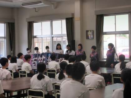 ソフトテニス男子、ソフトテニス女子、吹奏楽、クラブ活動の野球と弓道の各3年生の選手が中学校総合体育大会への抱負を話しました。