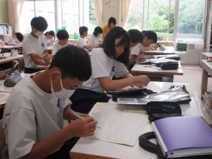 浮世絵と現代の風景や道具を組み合わせて、切り絵を作っています。トレーシングペーパーに細かな部分まで書き込んでいました。