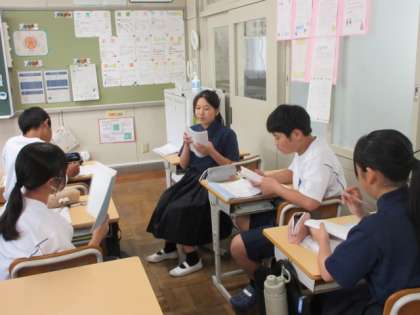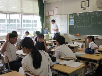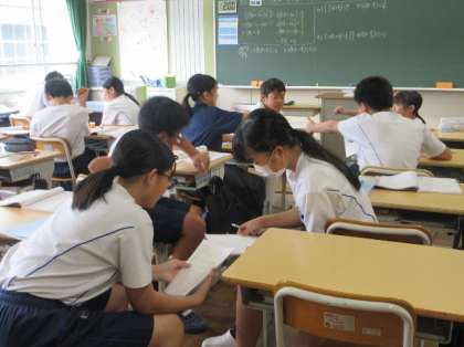 文字の式の問題を解き、自分が解いた方法をまわりの人に説明しています。