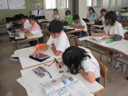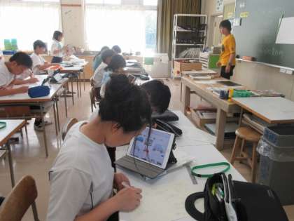 夏休み課題のポスターについて、どんなレイアウトにしようか考えています。レタリングの練習をしている人もいました。