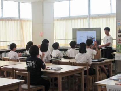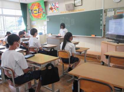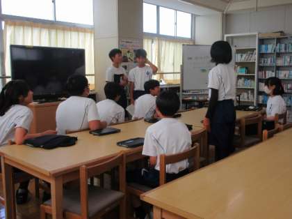 職場体験学習で学んだことについての発表練習をしています。互いに感想やアドバイスを伝えて、よりよいものにしようとがんばっています。