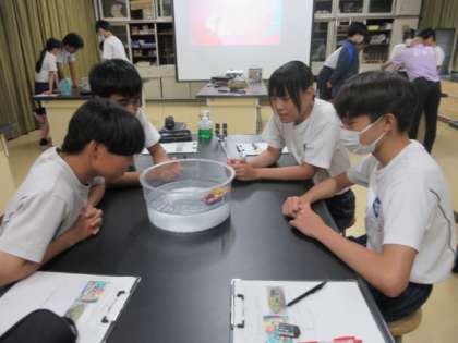 「ポンポン船はどのように走っているのか」模型を使って実験しています。