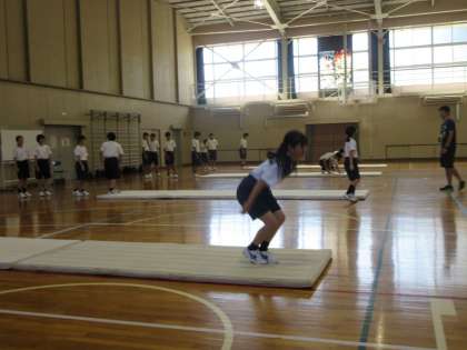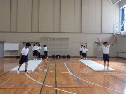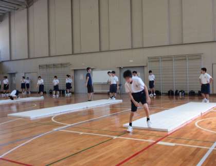 マット運動の学習です。前転や後転できれいに着地できるよう練習していました。